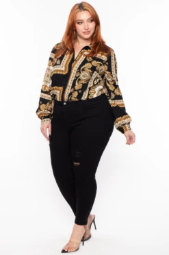 This plus size stretch top features an all over baroque print, collared neckline, long sleeves with one button closure, front button down closure, and a relaxed fit.